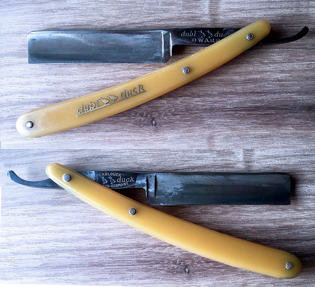 Here's a photo of a beat-up old Dubl Duck Dwarf I picked up off eBay a few years ago. Ugly frown and dirty, scratched up blade made me want to shelf it indefinitely. Scales and most of the hardware were in decent shape, however, with the exception of the hinge pin, which was pulling loose from a split in the washer.